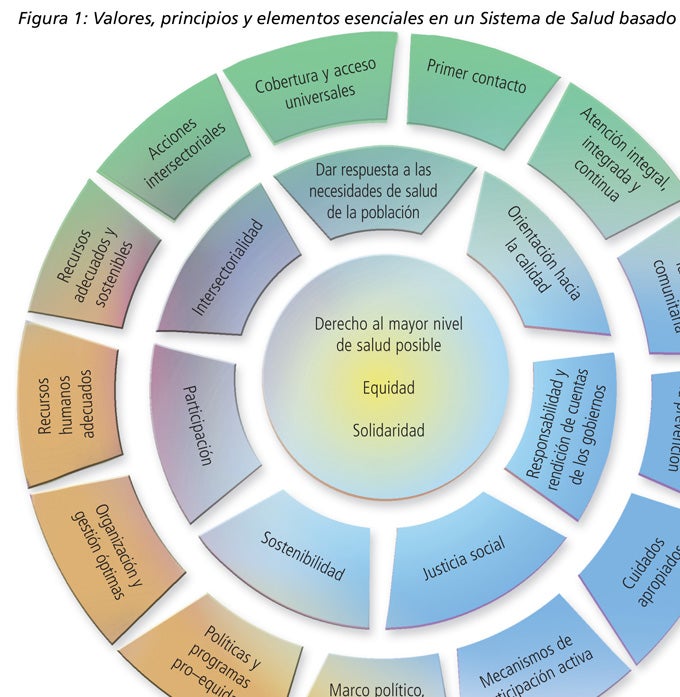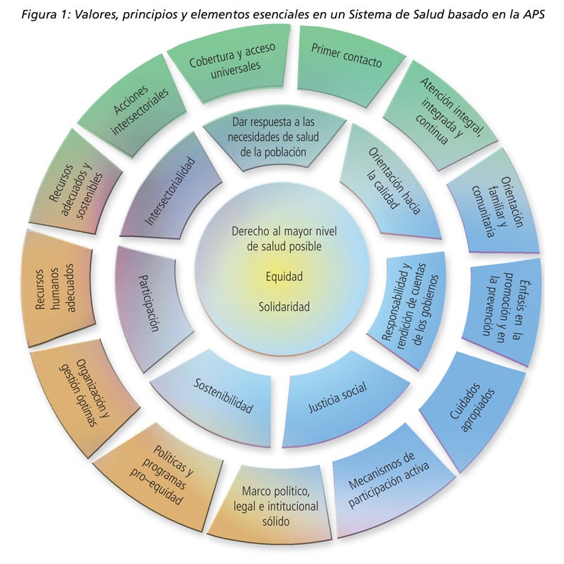 El documento de posición de la OPS/OMS expone tres valores centrales, siete principios y trece elementos esenciales que son los componentes fundamentales de un sistema de salud basado en la atención primaria de salud (véase la figura 1) y que, en su conjunto, permiten crear sistemas de salud que garanticen la cobertura y el acceso universal a servicios que sean aceptables para la población y que presten una atención amplia, integrada y apropiada a lo largo del tiempo, haciendo hincapié en la prevención y la promoción de la salud. Estos sistemas consideran a la familia y la comunidad como la base para la planificación y la acción, y potencian al máximo tanto la participación individual como colectiva en la formulación de políticas, el establecimiento de prioridades y la adopción de decisiones con respecto a su propia salud. Promueven la solidaridad, la justicia social y la equidad en el acceso no solo a los servicios sino a otras condiciones que son esenciales para una buena salud.