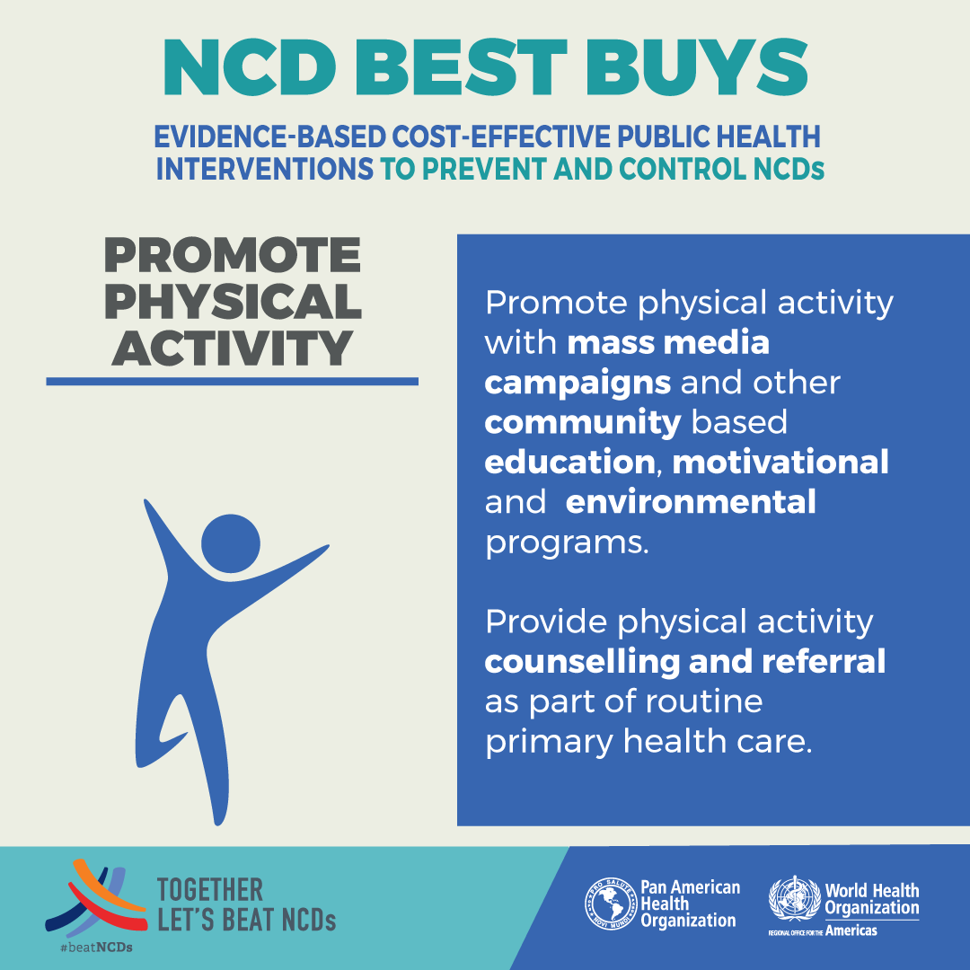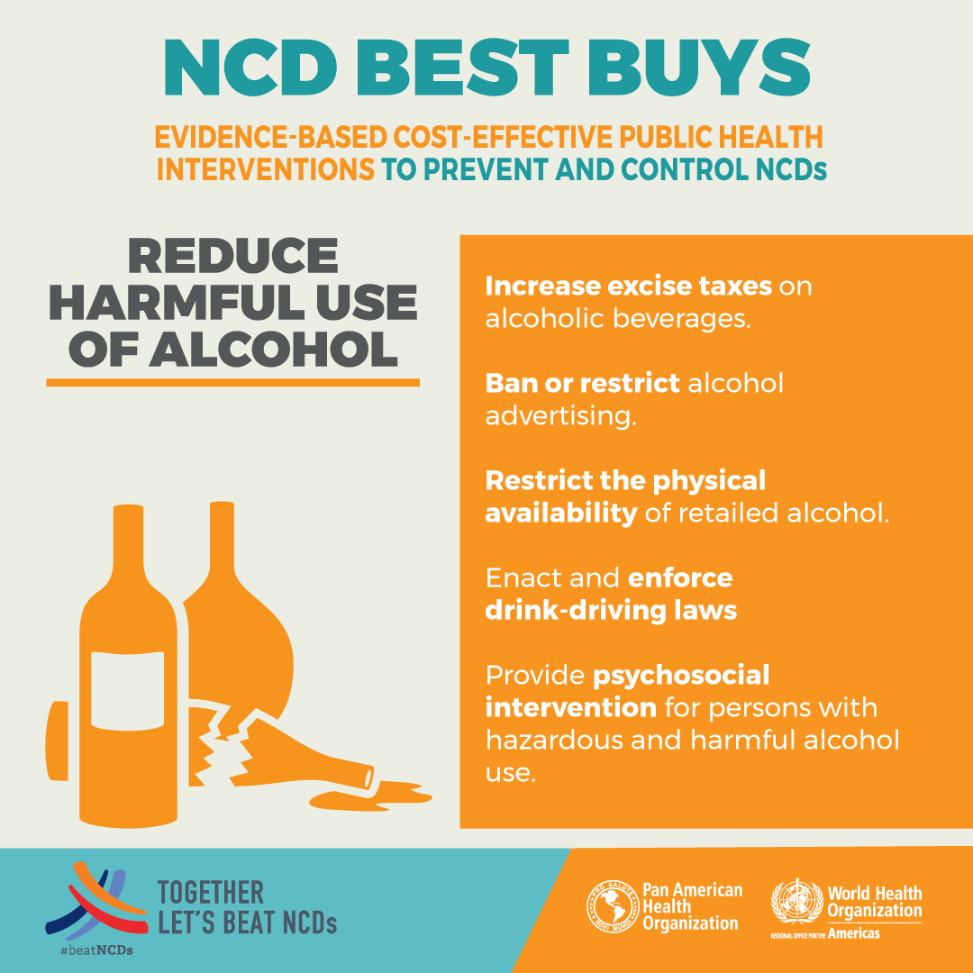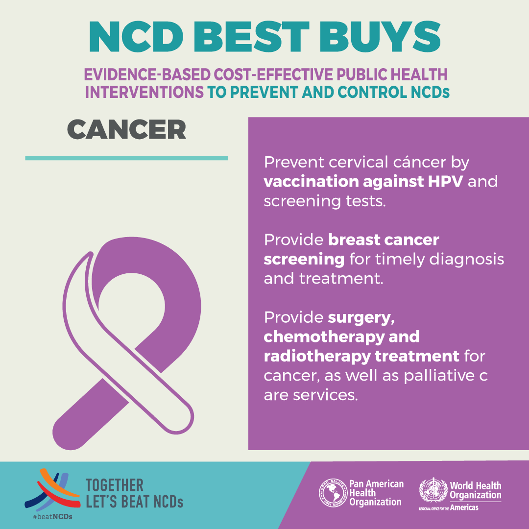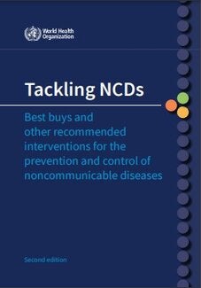 The NCD Best buys are based on the Appendix 3 of the Global action plan for the prevention and control of noncommunicable diseases 2013–2020, updated in 2022 and endorsed by the Seventy-sixth World Health Assembly in 2023. The Appendix 3 addresses objectives 3 and 4 of the Global action plan, by presenting a menu of policy options, cost-effective and recommended interventions for each of the four key risk factors for NCDs (tobacco, harmful use of alcohol, unhealthy diet and physical inactivity) and for four disease areas (cardiovascular disease, diabetes, chronic respiratory disease and cancer).