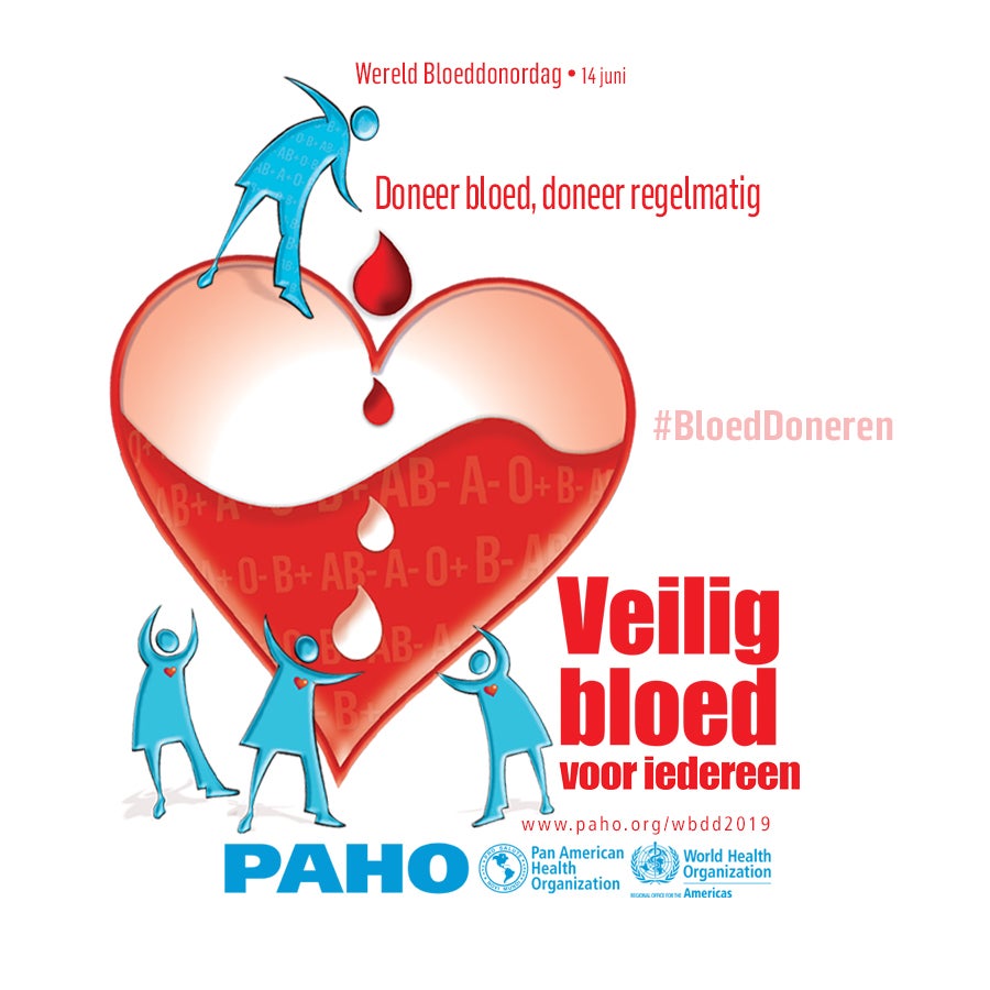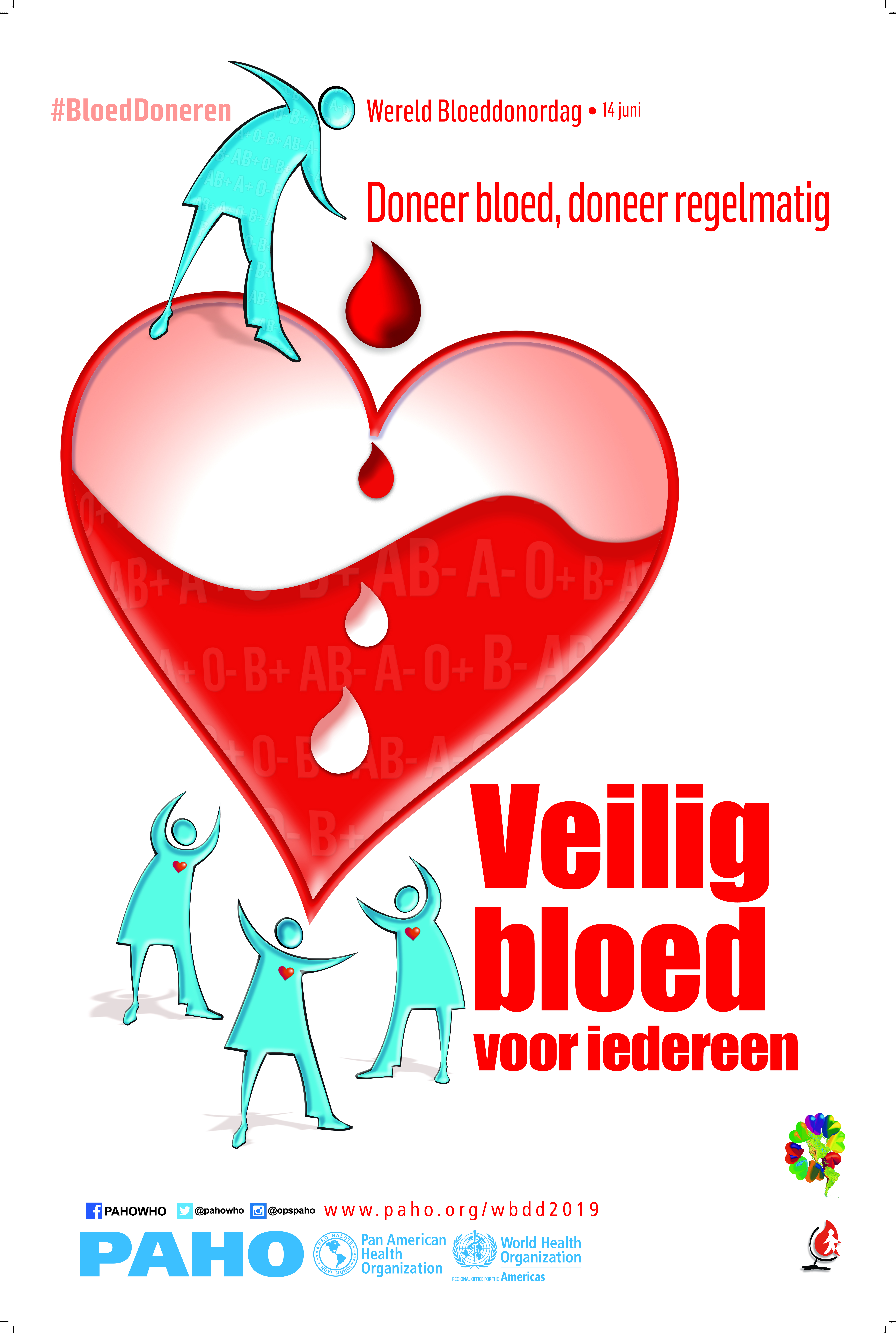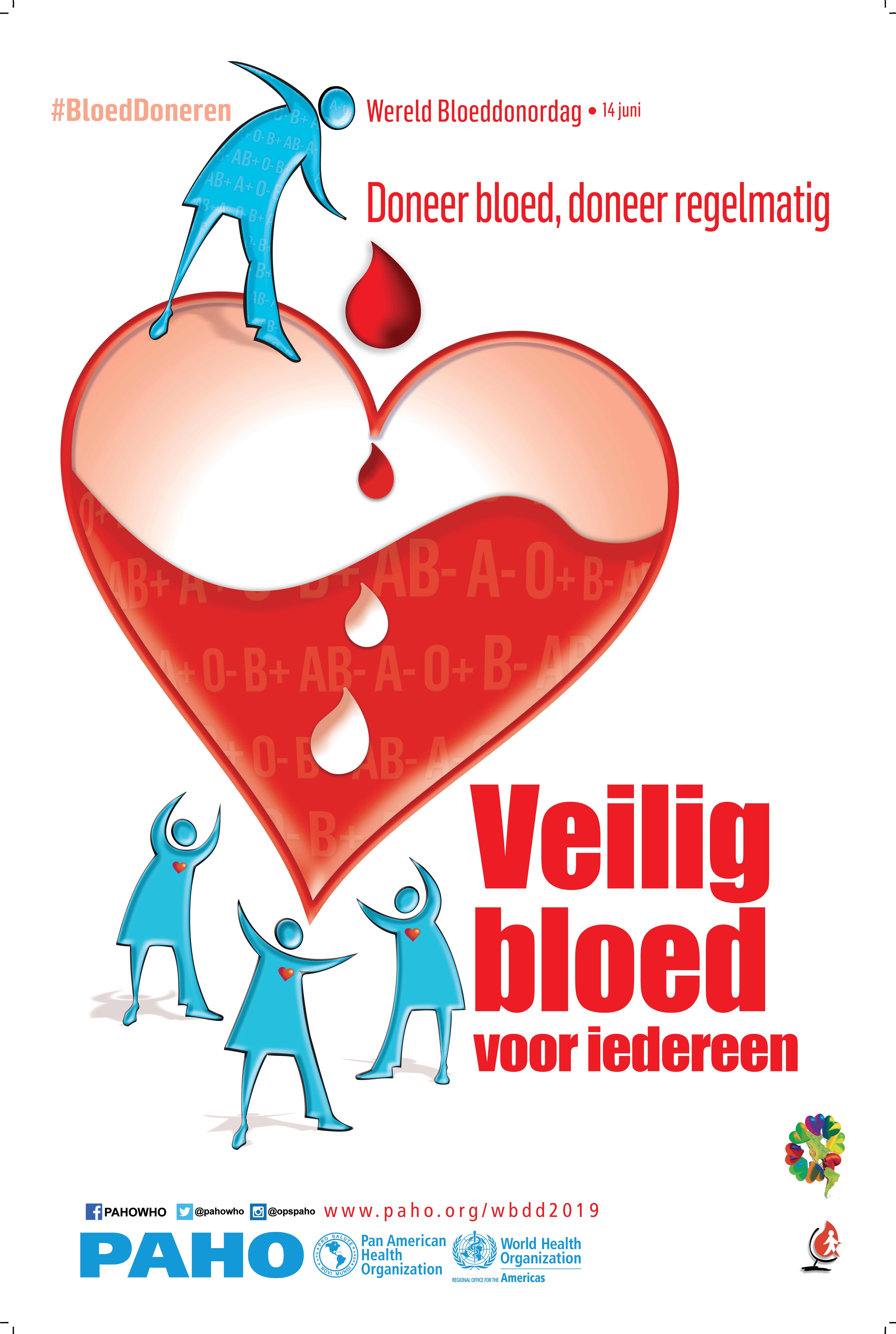 - Poster: Wereld Bloeddonordag. Doneer bloed, doneer regelmatig. Veilig bloed voor iedereen. 14 juni 2019 (Nederlands, PDF 10.7 MB)