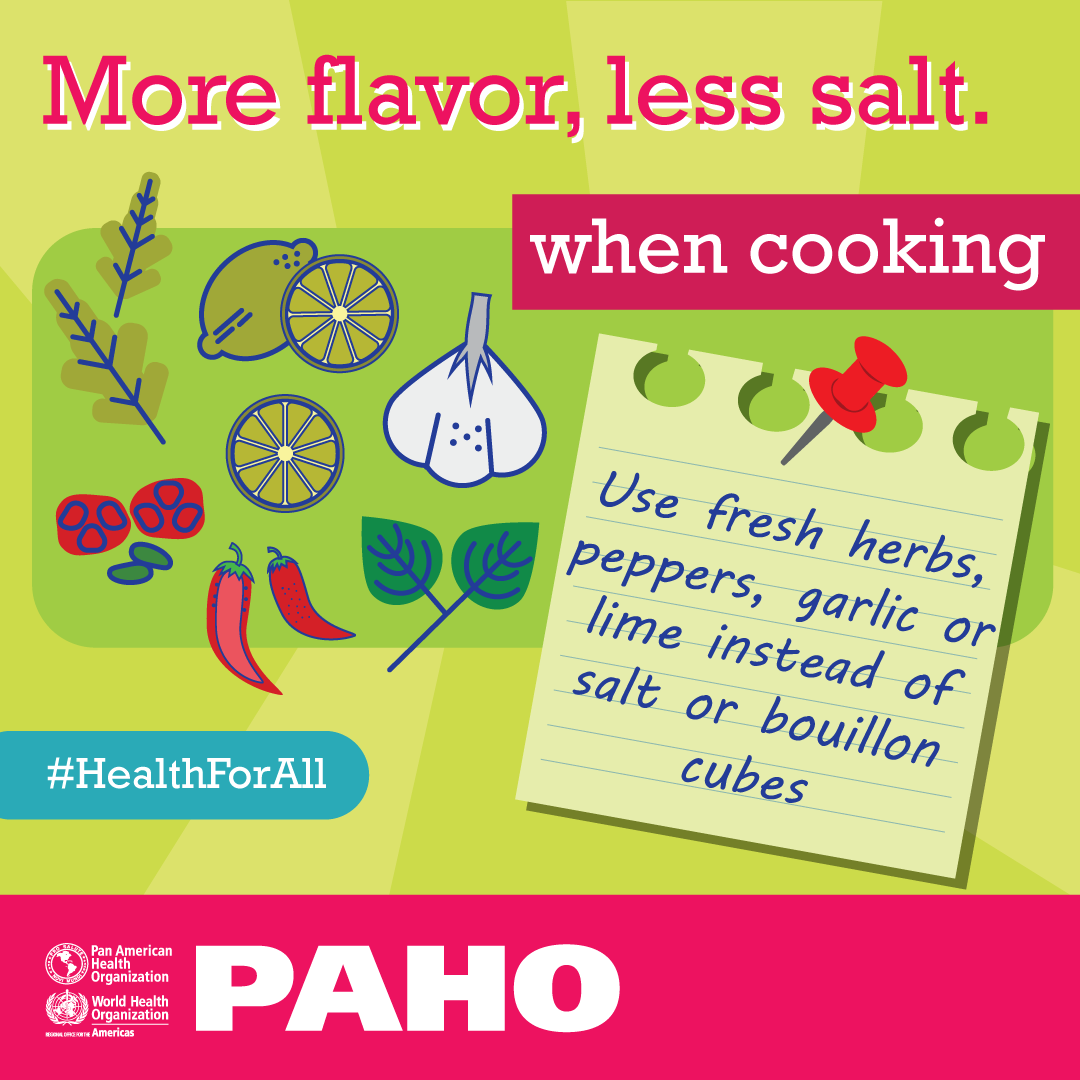 During Salt Awareness Week, PAHO wants to encourage people and families in the Region to use less salt and replace it with herbs such as citrus, basil, oregano, cilantro, parsley, paprika, garlic, black pepper, cumin, and spices. It is crucial to cut the use of sauces such as soy sauce, ketchup and salad dressings which can contain lots of hidden salt. And finally, using lower salt-stocks or making your own from chicken bones could be a good idea to lower salt in our recipes.