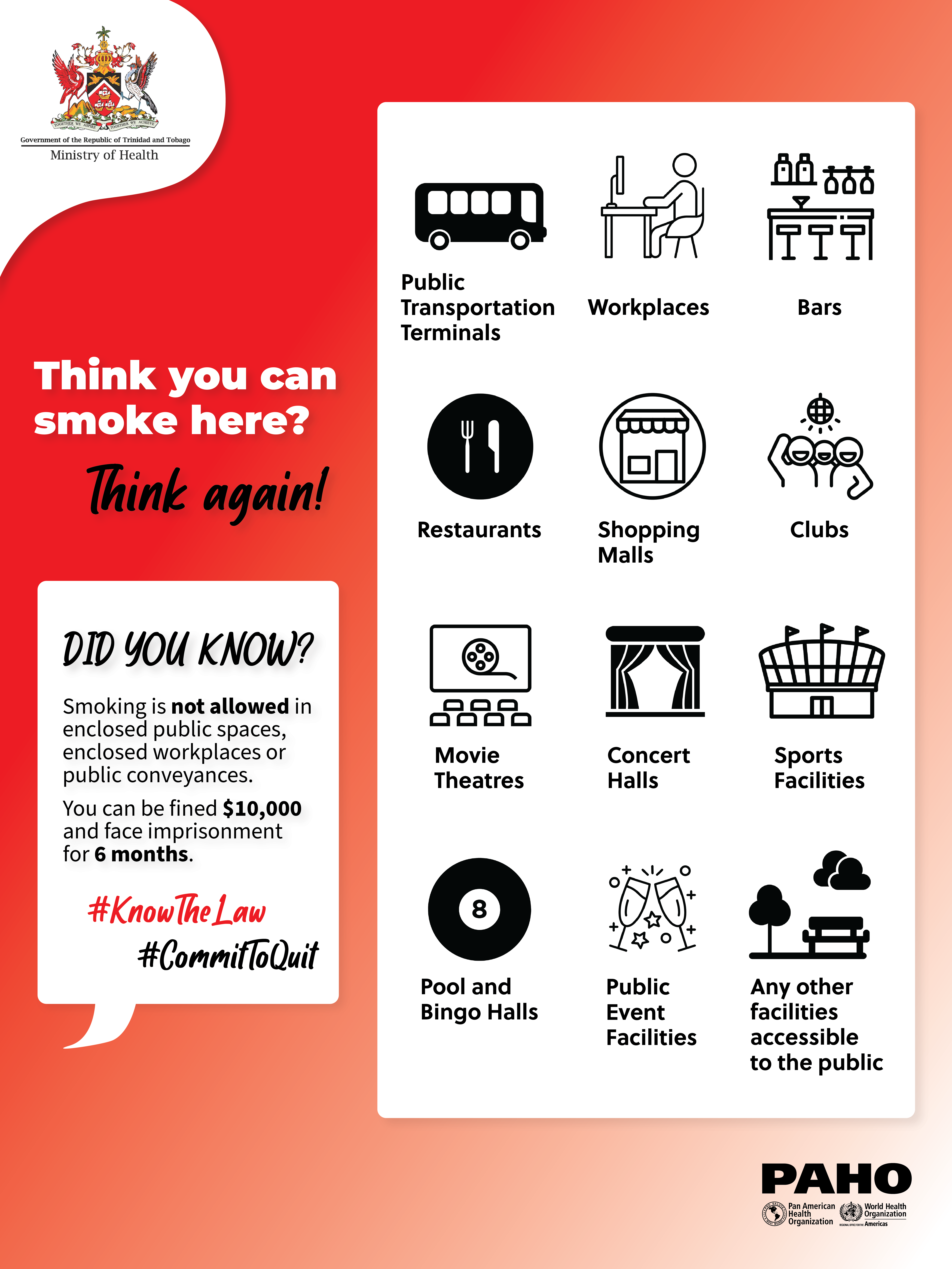 Objectives of the Commit to Quit campaign are to encourage smokers to quit tobacco by educating them on the harmful effects of tobacco use and guiding them to tobacco cessation clinics where they will be provided with the tools and support they need to cease tobacco use. The campaign also aims to address secondhand smoking and to introduce the public of Trinidad and Tobago to the Tobacco Control Act and the penalties for offenders.