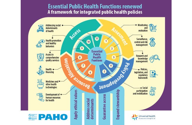 Considering regional mandates to advance towards universal health within the context of evolving health emergencies, PAHO/WHO has led the renewal of the Essential Public Health Functions (EPHF) in the Americas. The ongoing COVID-10 pandemic and previous public health emergencies in the Americas have demonstrated that inequitable and fragmented health systems that do not meet the needs of the population in normal times, cannot effectively address health needs during epidemics and other health emergencies. The COVID-19 pandemic has revealed both strengths and weaknesses in health systems and, overall, the centrality of public health to advancing towards the achievement of universal health, to better respond to health emergencies and to safeguard equity in health.