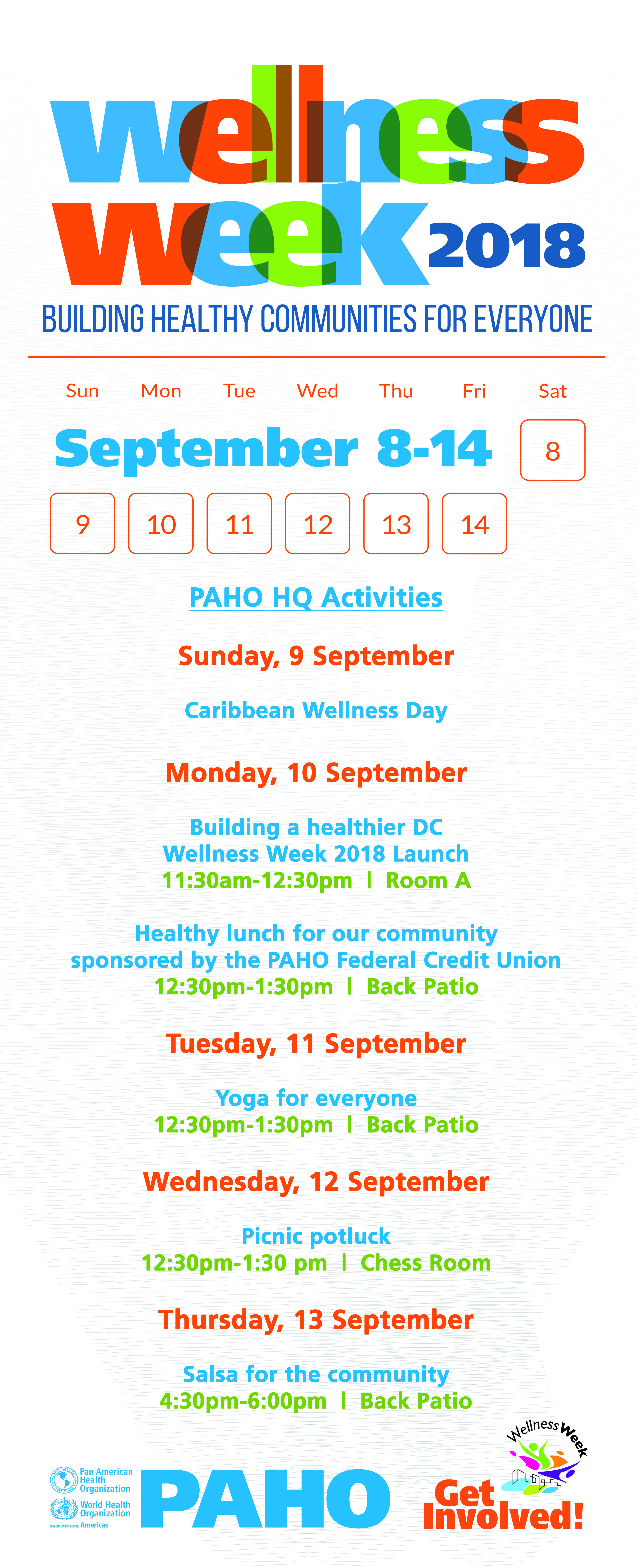 PAHO´s Wellness Week is an initiative that began in 2011 inspired by Caribbean Wellness Day, which is celebrated on the second Saturday of September. Given the increase in noncommunicable diseases worldwide, Wellness Week was launched with the purpose of mobilizing all institutions, including local authorities, the public and private commercial sector, civil society organizations, and the public to highlight the importance of making sure that the healthy choice is the easiest choice and, in such way, facilitate the uptake of healthy lifestyles.