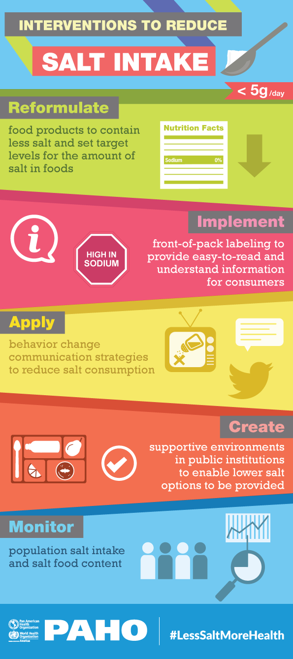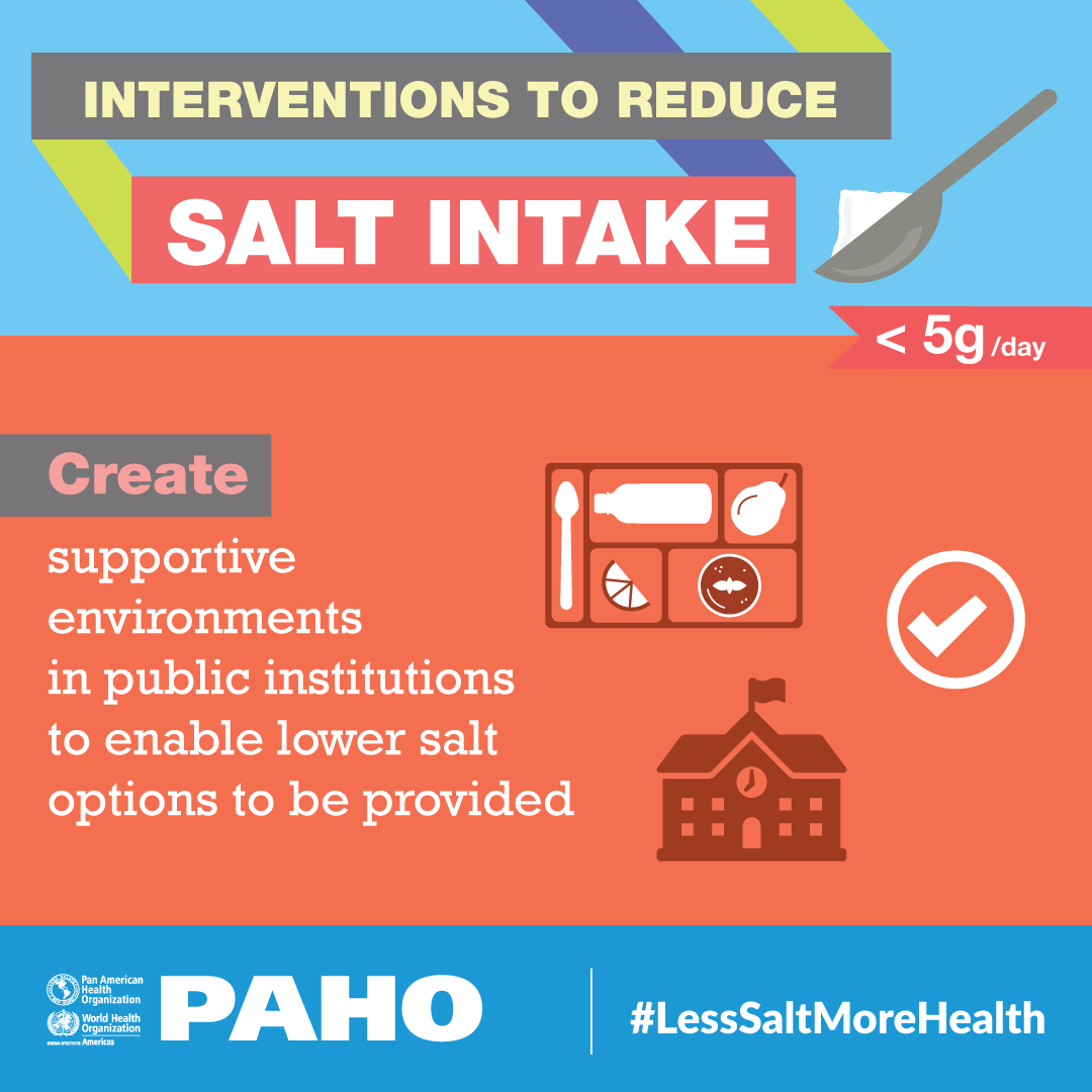 The reduction of salt/sodium consumption is one of the most cost-effective interventions to prevent hypertension and CVDs. The interventions to achieve it include:
