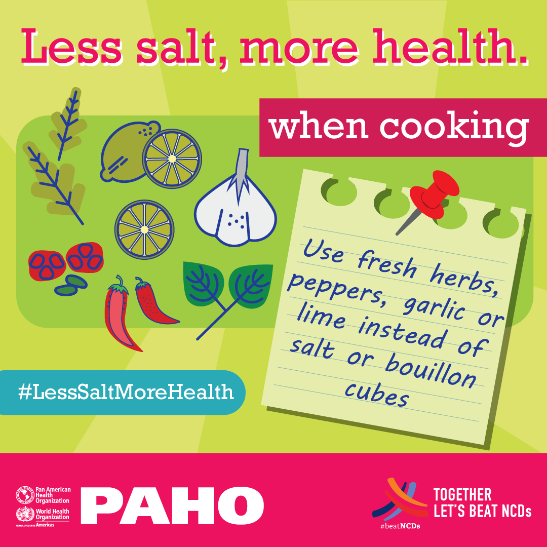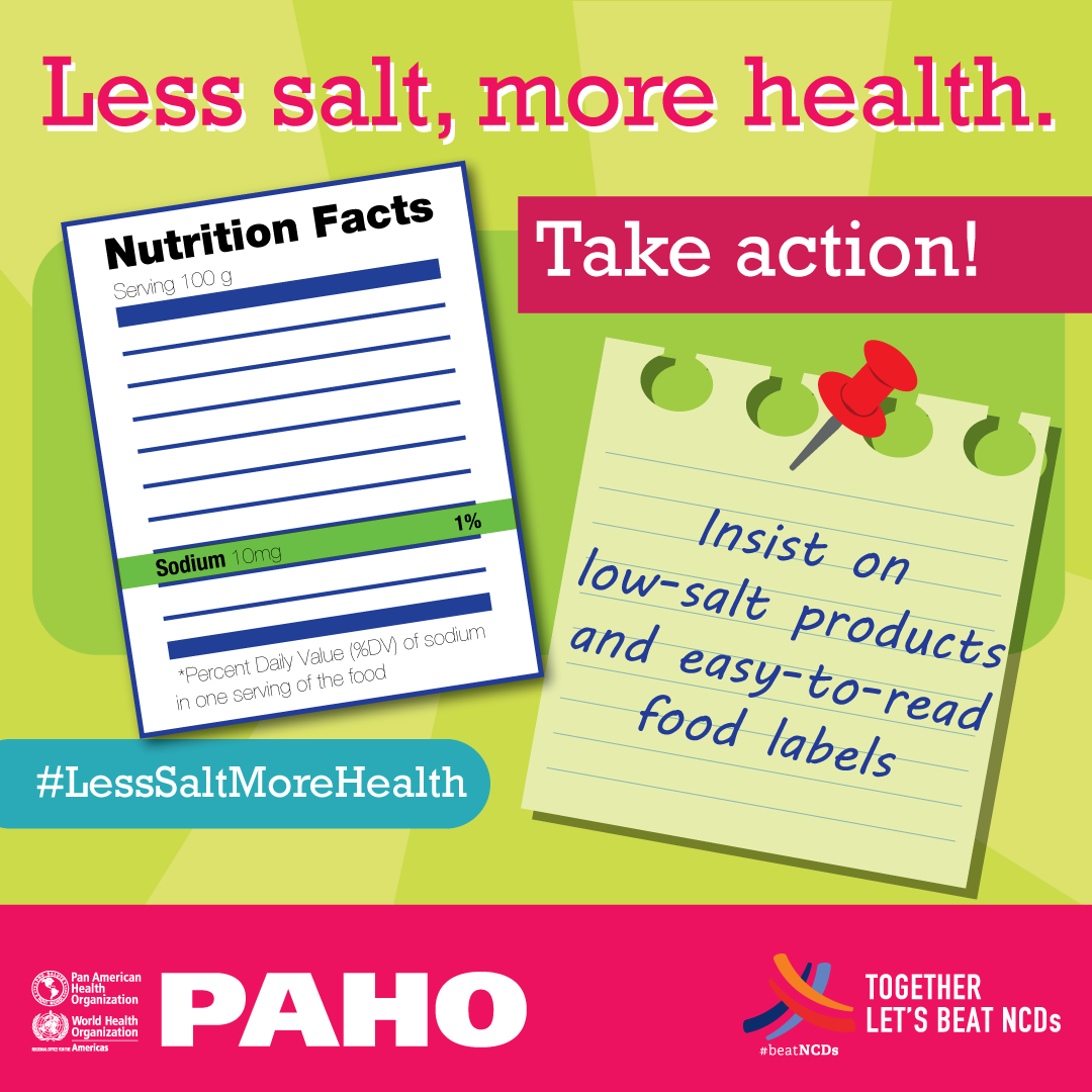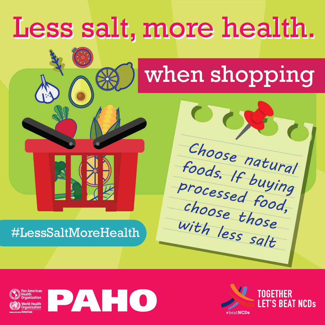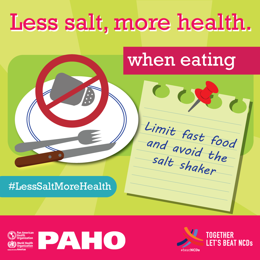 That excessive consumption of salt/sodium adversely affects blood pressure is irrefutable. Consuming less than 5 g/ salt (< 2 g of sodium) per adult per day, from all sources, is the WHO recommended limit and the target that countries are to aim for with their dietary salt/sodium reduction initiatives. The country level target is a 30% relative reduction in mean population intake, between 2010 and 2025. Salt/sodium consumption in the Region of the Americas is well above the recommended limit. Among eight countries in the Region with data as of 2015, daily salt intake per person ranges from 8.5 g to 15 g.