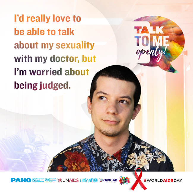 World AIDS Day 2019: Postcard for social media. "I'd really love to be able to talk about sexuality with my doctor, but I'm worried about being judge"