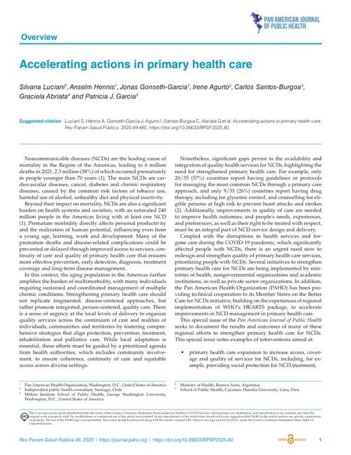 Noncommunicable diseases (NCDs) are the leading cause of mortality in the Region of the Americas, leading to 6 million deaths in 2021, 2.3 million (38%) of which occurred prematurely in people younger than 70 years (1). The main NCDs are cardiovascular diseases, cancer, diabetes and chronic respiratory diseases, caused by the common risk factors of tobacco use, harmful use of alcohol, unhealthy diet and physical inactivity. Beyond their impact on mortality, NCDs are also a significant burden on health systems and societies, with an estimated 240 million people in the Americas living with at least one NCD (1). Premature morbidity directly affects personal productivity and the realization of human potential, influencing even from a young age, learning, work and development. Many of the premature deaths and disease-related complications could be prevented or delayed through improved access to services, continuity of care and quality of primary health care that ensures more effective prevention, early detection, diagnosis, treatment coverage and long-term disease management. |