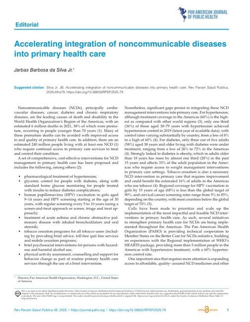 Noncommunicable diseases (NCDs), principally cardiovascular diseases, cancer, diabetes and chronic respiratory diseases, are the leading causes of death and disability in the World Health Organization’s Region of the Americas, with an estimated 6 million deaths in 2021, 38% of which were premature, occurring in people younger than 70 years (1). Many of these premature deaths can be avoided with improved access to and quality of primary health care. In addition, there are an estimated 240 million people living with at least one NCD (1) who require continual access to primary care services to treat and control their condition. |