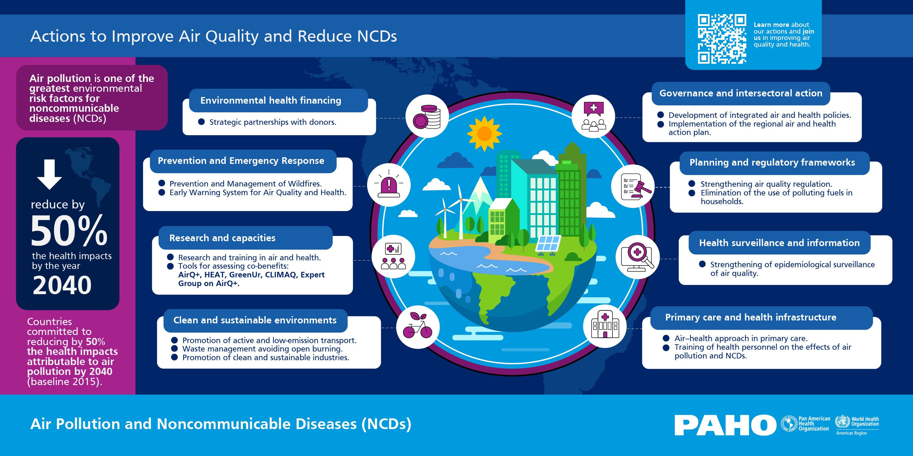 The file is an infographic titled “Actions to Improve Air Quality and Reduce NCDs”, created by PAHO (Pan American Health Organization). It focuses on the link between air pollution and noncommunicable diseases (NCDs) and outlines strategies to reduce health impacts. |