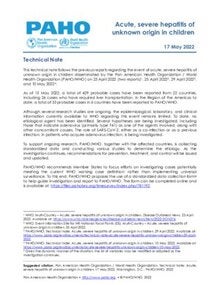 This technical note follows the previous reports regarding the event of acute, severe hepatitis of unknown origin in children disseminated by the Pan American Health Organization / World Health Organization (PAHO/WHO) on 23 April 2022 (two reports)1, 25 April 20222, 29 April 20223, and 10 May 20224. As of 15 May 2022, a total of 429 probable cases have been reported from 22 countries, including 26 cases that have required liver transplantation. In the Region of the Americas to date, a total of 33 probable cases in 6 countries have been reported to PAHO/WHO. Please download this technical note for more information. |