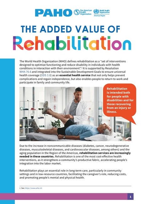 Rehabilitation plays an essential role in long-term care, particularly in community settings and in countries with fewer resources, as it facilitates the caregiver role, reduces costs, and promotes the mental and physical health of the individual. Rehabilitation is intended both for people with disabilities and anyone who needs to recover from an injury or illness. In recent years, the Pan American Health Organization (PAHO) has been helping countries in the Region of the Americas to strengthen rehabilitation services through situation analyses and the development of strategic plans. Good examples of this include interventions carried out in Aruba, the Bahamas, El Salvador, Guyana, and Uruguay. It is estimated that more than 220 million people could benefit from rehabilitation in the Region of the Americas. The recent increase in the proportion of years lived with disability (disability-adjusted life years, DALYs) in the Region is striking: the figure has risen from 22% to 32% in the last five years. This publication details the tools that PAHO makes available to countries in the Region to implement concrete measures in specific areas, such as leadership and governance; financing of rehabilitation; health information systems on rehabilitation; provision of specialized services (intervention packages and access to rehabilitation in primary health care); training of personnel; competency frameworks; consolidation of research and scientific data on rehabilitation; and strengthening of rehabilitation in emergencies. This publication details the tools that PAHO makes available to countries in the Region to implement concrete measures in specific areas, such as leadership and governance; financing of rehabilitation; health information systems on rehabilitation; provision of specialized services (intervention packages and access to rehabilitation in primary health care); training of personnel; competency frameworks; consolidation of research and scientific data on rehabilitation; and strengthening of rehabilitation in emergencies. |