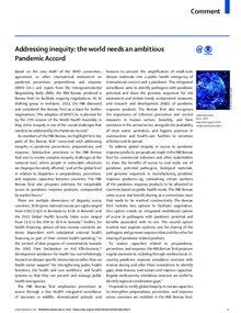 Based on the zero draft1 of the WHO convention, agreement, or other international instrument on pandemic prevention, preparedness, and response (WHO CA+) and inputs from the Intergovernmental Negotiating Body (INB), the INB Bureau produced a Bureau Text2 to facilitate ongoing negotiations. At its drafting group in mid-June, 2023, the INB discussed and considered this Bureau Text as a basis for further negotiations.3 The adoption of WHO CA+ is planned for by the 77th session of the World Health Assembly in May, 2024. Inequity is one of the crucial challenges that needs to be addressed by the Pandemic Accord. |