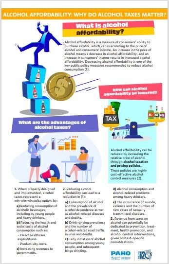 Decreasing alcohol affordability is one of the main public policy measures recommended to reduce alcohol consumption. This fact sheet describes what is alcohol affordability and how it can be decreased, the advantages of alcohol taxes and the most effective tax policy option. It also presents effective non-tax price policy options that can complement tax policies and key policy considerations.