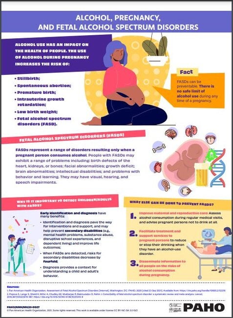 This fact sheet summarizes the risks of alcohol consumption during pregnancy. It explains the term fetal alcohol spectrum disorders (FASDs), and lists the problems they can cause, for example, birth defects, brain abnormalities, and problems with behavior and learning. The fact sheet stresses the importance of preventing FASDs in both children and adults, and explains how to do so.