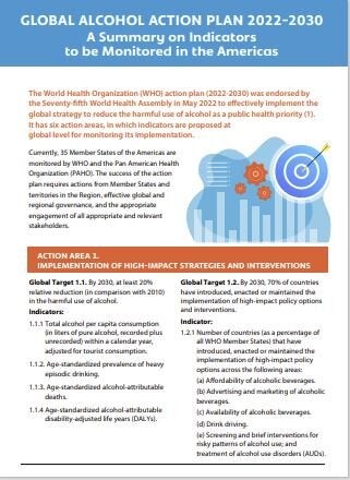 The World Health Organization global alcohol action plan 2022–2030 was endorsed by the Seventy-fifth World Health Assembly in May 2022 to effectively implement the global strategy to reduce the harmful use of alcohol as a public health priority. This factsheet presents a summary of the proposed indicators at global level for monitoring its implementation in the Americas.