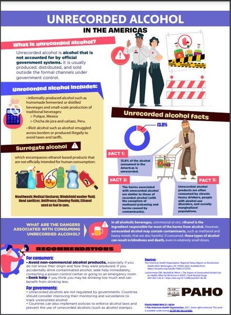 This fact sheet provides information on unrecorded alcohol. Unrecorded alcohol is alcohol that is not accounted for by official government systems and is usually produced, distributed, and sold outside the formal channels under government control. The fact sheet outlines the types of unrecorded alcohol and the dangers to health associated with its consumption. It also provides recommendations for consumers on non-commercial alcohol products and for governments on the regulation of unrecorded alcohol.