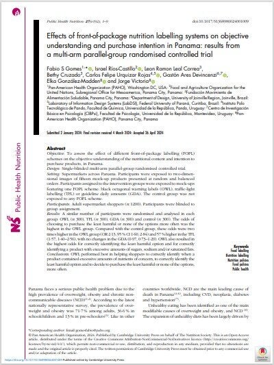 This article was published on Public Health Nutrition on 16 May 2024 AbstractObjective: To assess the effect of different front-of-package labelling (FOPL) schemes on the objective understanding of the nutritional content and intention to purchase products, in Panama. Design: Single-blinded multi-arm parallel-group randomised controlled trial. Setting: Supermarkets across Panama. Participants were exposed to two-dimensional images of fifteen mock-up products presented at random and balanced orders. Participants assigned to the intervention groups were exposed to mock-ups featuring one FOPL scheme: black octagonal warning labels (OWL), traffic-light labelling (TFL) or guideline daily amounts (GDA). The control group was not exposed to any FOPL scheme. Participants: Adult supermarket shoppers (n 1200). Participants were blinded to group assignment. Results: A similar number of participants were randomised and analysed in each group: OWL (n 300), TFL (n 300), GDA (n 300) and control (n 300). The odds of choosing to purchase the least harmful or none of the options more often was the highest in the OWL group. Compared with the control group, these odds were two times higher in the OWL group (OR 2·13, 95 % CI 1·60, 2·84) and 57 % higher in the TFL (1·57, 1·40–2·56), with no changes in the GDA (0·97, 0·73–1·29). OWL also resulted in the highest odds for correctly identifying the least harmful option and for correctly identifying a product with excessive amounts of sugars, sodium and/or saturated fats. Conclusions: OWL performed best in helping shoppers to correctly identify when a product contained excessive amounts of nutrients of concern, to correctly identify the least harmful option and to decide to purchase the least harmful or none of the options, more often. |