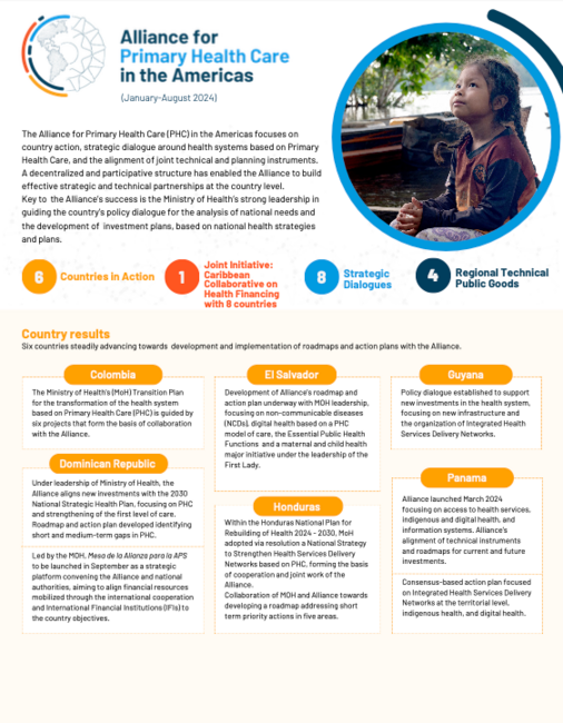 The Alliance for Primary Health Care (PHC) in the Americas focuses on country action, strategic dialogue around health systems based on Primary Health Care, and the alignment of joint technical and planning instruments. A decentralized and participative structure has enabled the Alliance to build effective strategic and technical partnerships at the country level. Key to the Alliance’s success is the Ministry of Health’s strong leadership in guiding the country’s policy dialogue for the analysis of national needs and the development of investment plans, based on national health strategies and plans. This document summarizes the work done by the Alliance from January to August 2024, highlighting its commitment to advancing these objectives across the region. |