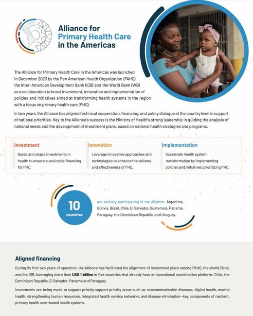 The Alliance for Primary Health Care in the Americas was launched in December 2023 by the Pan American Health Organization (PAHO), the Inter-American Development Bank (IDB) and the World Bank (WB) as a collaboration to boost investment, innovation and implementation of policies and initiatives aimed at transforming health systems in the region with a focus on primary health care (PHC). In two years, the Alliance has aligned technical cooperation, financing, and policy dialogue at the country level in support of national priorities. Key to the Alliance’s success is the Ministry of Health’s strong leadership in guiding the analysis of national needs and the development of investment plans, based on national health strategies and programs. |
