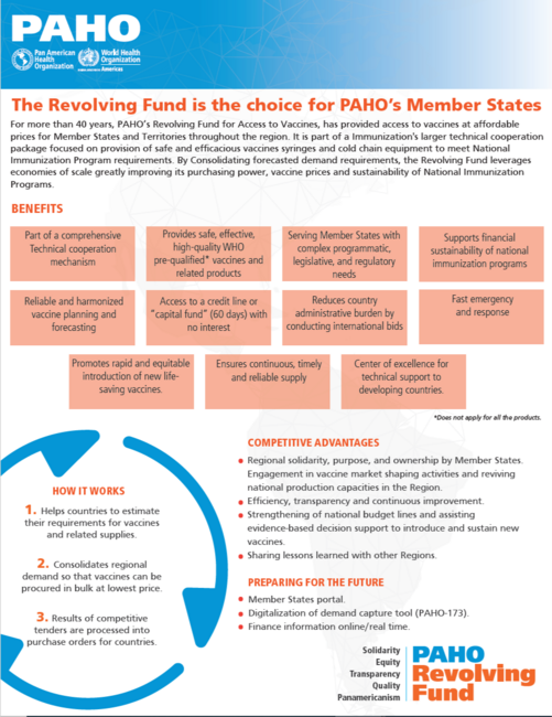 For more than 40 years, PAHO’s Revolving Fund for Access to Vaccines, has provided access to vaccines at affordable prices for Member States and Territories throughout the region. It is part of Immunization's larger technical cooperation package focused on provision of safe and efficacious vaccines, syringes and cold chain equipment to meet National Immunization Program requirements. By consolidating forecasted demand requirements, the Revolving Fund leverages economies of scale greatly improving its purchasing power, lowering vaccine prices and contributing to the sustainability of National Immunization Programs.