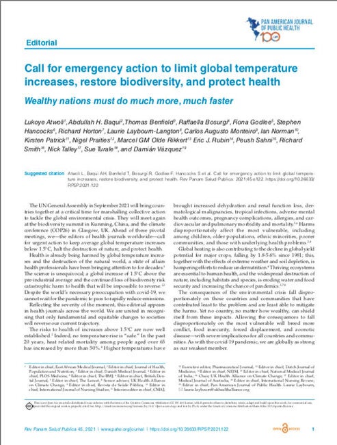 The UN General Assembly in September 2021 will bring coun-tries together at a critical time for marshalling collective action to tackle the global environmental crisis. They will meet again at the biodiversity summit in Kunming, China, and the climate conference (COP26) in Glasgow, UK. Ahead of these pivotal meetings, we—the editors of health journals worldwide—call for urgent action to keep average global temperature increases below 1.5°C, halt the destruction of nature, and protect health.Health is already being harmed by global temperature increa-ses and the destruction of the natural world, a state of affairs health professionals have been bringing attention to for decades.
