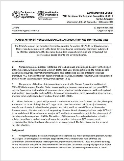 PresentationNoncommunicable diseases (NCDs) are the leading cause of death and disability in the Region of the Americas, with an estimated 6 million deaths each year and an estimated 240 million people living with an NCD (1). International frameworks have established a series of targets to reduce premature NCD mortality through health promoting activities, risk factor reduction, and strengthened primary health system capacity for NCD management (2, 3). The purpose of the Plan of Action on Noncommunicable Disease Prevention and Control 2025–2030 is to support Member States in accelerating actions necessary to meet the global NCD targets. Recognizing that a whole-of-government and whole-of-society approach—with multisectoral partnerships—is needed to address NCDs, the plan of action outlines three overarching strategic lines of action to be implemented over its time frame (2025–2030). Given the broad scope of NCD prevention and control and the time frame of this plan, the topics are focused on those of the global NCD targets that cover the common risk factors (tobacco use, harmful use of alcohol, unhealthy diet, physical inactivity) and four main NCDs—cardiovascular diseases, cancer, diabetes, and chronic respiratory diseases. Obesity is recognized as a major NCD risk factor and chronic kidney disease as a major NCD, and both are considered within this plan as part of the integrated management of NCDs. The actions of this plan are focused on risk factor reduction policies, surveillance, and primary health care interventions to improve NCD management, recognizing that higher-level care also needs to be strengthened. The latter is outside the scope of this plan of action. Related links |