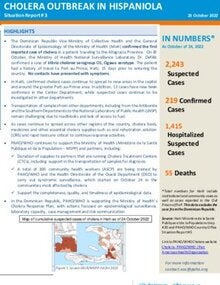 The Dominican Republic Vice-Ministry of Collective Health and the General Directorate of Epidemiology of the Ministry of Health (MoH) confirmed the first imported case of cholera in a patient traveling to the Altagracia Province. On 20 October, the Ministry of Health National Surveillance Laboratory Dr. Defilló confirmed a case of Vibrio cholerae serogroup O1, Ogawa serotype. The patient had a history of travel to Port-au-Prince, Haiti, 15 days prior to entering the country. No contacts have presented with symptoms.