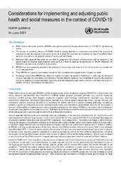 Public health and social measures (PHSM) have proven critical to limiting transmission of COVID-19 and reducing deaths. The decision to introduce, adapt or lift PHSM should be based primarily on a situational assessment of the intensity of transmission and the capacity of the health system to respond, but must also be considered in light of the effects these measures may have on the general welfare of society and individuals. Indicators and suggested thresholds are provided to gauge both the intensity of transmission and the capacity of the health system to respond; taken together, these provide a basis for guiding the adjustment of PHSM. Measures are indicative and need to be tailored to local contexts. PHSM must be continuously adjusted to the intensity of transmission and capacity of the health system in a country and at sub-national levels. When PHSM are adjusted, communities should be fully consulted and engaged before changes are made. In settings where robust PHSMs are otherwise in place to control the spread of SARS-CoV-2, allowing the relaxation of some measures for individuals with natural or vaccine-induced immunity may contribute to limiting the economic and social hardship of control measures. Applying such individualized public health measures must take into account a number of ethical and technical considerations.