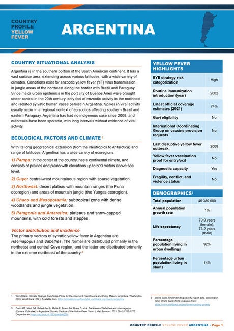 This country profile presents a summary and analysis of Argentina's status with yellow fever. It is part of a series of profiles on this topic, each focusing on a different country in the Region of the Americas. Argentina's geographical location presents a wide territorial extension throughout different latitudes, which determines a wide climatic variety, maintaining the conditions for the enzootic transmission of the yellow fever virus in jungle areas of the northeast of the country bordering Brazil and Paraguay. After controlling the major urban epidemics that hit the port city of Buenos Aires in the 20th century, Argentina maintains foci of enzootic activity in the northeast and isolated human cases for jungle acquisition. The increases in viral activity usually occur in a regional context of epizootics that affect southern Brazil and eastern Paraguay. Argentina has not presented autochthonous cases since 2008. Outbreaks have been sporadic with long intervals without evidence of viral activity.
