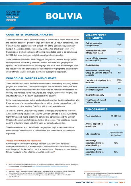 Yellow fever is endemic in several Latin American countries, restricted to enzootic regions of Argentina, Bolivia, Brazil, Colombia, Ecuador, French Guyana, Guyana, Panama, Paraguay, Peru, Suriname, Trinidad and Tobago, and Venezuela. Since the 1950s, urban epidemics have been controlled by a campaign to eradicate Aedes aegypti. Decades later, the mosquito re-infested most of the areas it occupied, spreading other Aedes-borne diseases, dengue, zika and chikungunya, and re-establishing the risk of urban fever epidemics. Yellow fever can be prevented by administering a vaccine. Enzootic countries introduced this vaccine into routine immunization schedules for children between 9 and 18 months of age. However, the drop in vaccination coverage results in a high risk of new outbreaks of varying magnitude. To assist decision-makers in prioritizing preventive actions against this disease, the Pan American Health Organization presents these country profiles with a concise and comprehensive selection of data from endemic countries. Each profile provides an analysis of the current country situation, ecological, and climatic factors associated with the disease, vector distribution and incidence, and key arboviral activity. It also includes a historical perspective of the epidemiology and a summary of the disease vaccination situation in the country. Each of these yellow fever country profiles expands on the situation of yellow fever in each country, including vaccination coverage, number of cases, regional information within the country for presence of the virus, past yellow fever outbreaks, epidemiology, areas with endemicity, arboviral activity, and vaccination campaigns, among other important national and regional indicators. |
