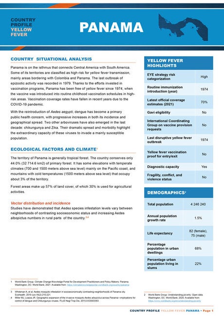 Yellow fever is endemic in several Latin American countries, restricted to enzootic regions of Argentina, Bolivia, Brazil, Colombia, Ecuador, French Guyana, Guyana, Panama, Paraguay, Peru, Suriname, Trinidad and Tobago, and Venezuela. Since the 1950s, urban epidemics have been controlled by a campaign to eradicate Aedes aegypti. Decades later, the mosquito re-infested most of the areas it occupied, spreading other Aedes-borne diseases, dengue, zika and chikungunya, and re-establishing the risk of urban fever epidemics. Yellow fever can be prevented by administering a vaccine. Enzootic countries introduced this vaccine into routine immunization schedules for children between 9 and 18 months of age. However, the drop in vaccination coverage results in a high risk of new outbreaks of varying magnitude. To assist decision-makers in prioritizing preventive actions against this disease, the Pan American Health Organization presents these country profiles with a concise and comprehensive selection of data from endemic countries. Each profile provides an analysis of the current country situation, ecological, and climatic factors associated with the disease, vector distribution and incidence, and key arboviral activity. It also includes a historical perspective of the epidemiology and a summary of the disease vaccination situation in the country. Each of these yellow fever country profiles expands on the situation of yellow fever in each country, including vaccination coverage, number of cases, regional information within the country for presence of the virus, past yellow fever outbreaks, epidemiology, areas with endemicity, arboviral activity, and vaccination campaigns, among other important national and regional indicators.