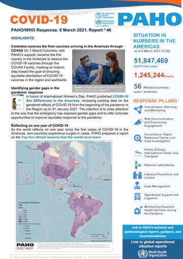 Colombia receives the first vaccines arriving in the Americas through COVAX On 1 March Colombia, with PAHO’s support, became the first country in the Americas to receive the COVID-19 vaccines through the COVAX Facility, marking an historic step toward the goal of ensuring equitable distribution of COVID-19 vaccines in the region and worldwide.