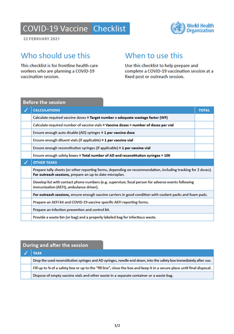 The COVID-19 vaccine checklist is for frontline health workers planning a COVID-19 vaccination session. This checklist can help them to prepare and complete a COVID-19 vaccination session at a fixed post or outreach session.