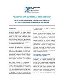 In several countries of the Americas, there has been evidence of the continued promotion, through supposed “clinics” or individual “therapists,” of services aimed at “curing” non-heterosexual orientation, an approach known as “reparative” or “conversion therapy.” Worryingly, these services are often provided not just outside the sphere of public attention but in a clandestine manner. From the perspective of professional ethics and human rights protected by regional and universal treaties and conventions such as the American Convention on Human Rights and its Additional Protocol (“Protocol of San Salvador”), they represent unjustifiable practices that should be denounced and subject to corresponding sanctions... |