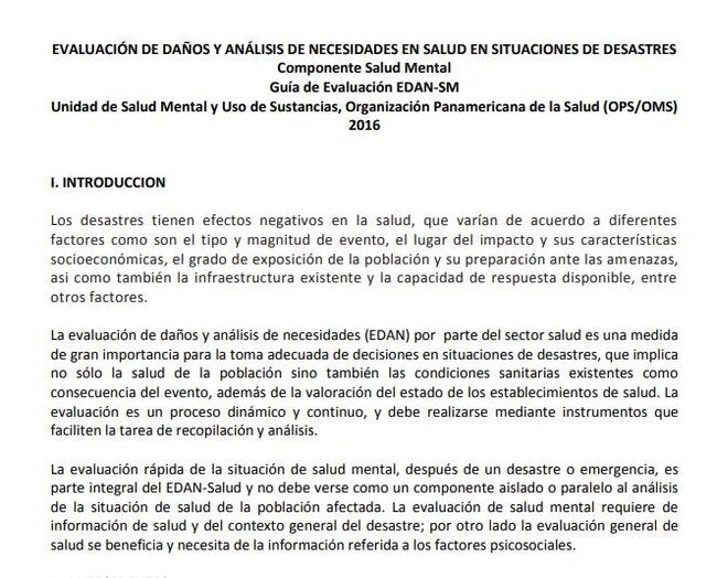 The damage assessment and needs analysis (EDAN) by the health sector is a measure of great importance for adequate decision-making in disaster situations. This involves not only the health of the population but also the existing health conditions as a consequence of the event, in addition to the assessment of the state of health establishments. Rapidly assessing the mental health situation after a disaster or emergency is integral to EDAN-Salud. It should not be seen as an isolated or parallel component to the analysis of the health situation of the affected population. Mental health assessment requires health information and the general context of the disaster. On the other hand, general health evaluations benefit and need information related to psychosocial factors. |
