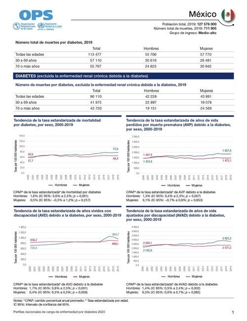 The fundamental purpose of this series of national profiles of the burden of disease due to diabetes and chronic kidney disease due to diabetes is to support the countries of the Region of the Americas in monitoring the strategies implemented to address diabetes. This first version of the profiles, which covers the period between 2000 and 2019, shows the trend in mortality, years of life lost due to premature death, years lived with disability, and disability-adjusted life years for both diseases. They have been prepared with the latest available data from the World Health Organization's global health estimates and are intended to become a useful tool for monitoring related strategies.