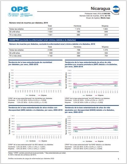 The fundamental purpose of this series of national profiles of the burden of disease due to diabetes and chronic kidney disease due to diabetes is to support the countries of the Region of the Americas in monitoring the strategies implemented to address diabetes. This first version of the profiles, which covers the period between 2000 and 2019, shows the trend in mortality, years of life lost due to premature death, years lived with disability, and disability-adjusted life years for both diseases. They have been prepared with the latest available data from the World Health Organization's global health estimates and are intended to become a useful tool for monitoring related strategies.