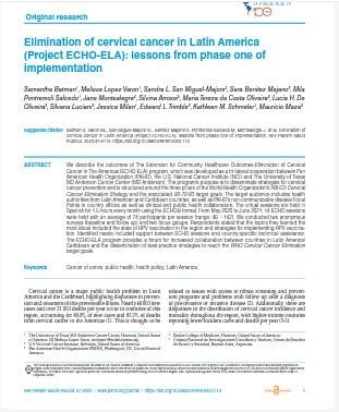 We describe the outcomes of The Extension for Community Healthcare Outcomes-Elimination of Cervical Cancer in The Americas (ECHO-ELA) program, which was developed as a tri-lateral cooperation between Pan American Health Organization (PAHO), the U.S. National Cancer Institute (NCI) and The University of Texas MD Anderson Cancer Center (MD Anderson). The program’s purpose is to disseminate strategies for cervical cancer prevention and is structured around the three pillars of the World Health Organization’s (WHO) Cervical Cancer Elimination Strategy and the associated 90-70-90 target goals. The target audience includes health authorities from Latin American and Caribbean countries, as well as PAHO’s non-communicable disease Focal Points in country offices as well as clinical and public health collaborators. The virtual sessions are held in Spanish for 1.5 hours every month using the ECHO® format. From May 2020 to June 2021, 14 ECHO sessions were held with an average of 74 participants per session (range: 46 – 142). We conducted two anonymous surveys (baseline and follow up) and two focus groups. Respondents stated that the topics they learned the most about included the state of HPV vaccination in the region and strategies for implementing HPV vaccina- tion. Identified needs included support between ECHO sessions and country-specific technical assistance. The ECHO-ELA program provides a forum for increased collaboration between countries in Latin America/ Caribbean and the dissemination of best-practice strategies to reach the WHO Cervical Cancer Elimination target goals.