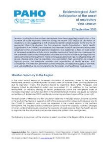 Several countries from the southern hemisphere have been reporting an early start of the increase of acute respiratory infection during the recent 2023 season of circulation of respiratory viruses, suggesting a shift of seasonal pattern observed prior to the COVID-19 pandemic. Given this situation, the Pan American Health Organization / World Health Organization (PAHO/WHO) recommends that Member States of the northern hemisphere adjust prevention and control plans for respiratory virus epidemics to face an early onset of increased respiratory activity and a possible overload of health services. Measures for the prevention and control of respiratory virus infections should include early diagnosis and adequate clinical management, mainly among populations at high risk of presenting with severe disease, and ensuring respiratory virus vaccination, high vaccination coverage in high-risk groups, the adequate provision and organization of health services, strict compliance with infection prevention control measures, an adequate supply of antivirals, and well as effective risk communication for the public and healthcare professionals. |