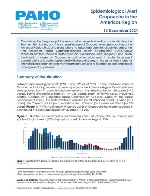 Considering the beginning of the season of increased circulation of arbovirosis in the Southern Hemisphere and the increase in cases of Oropouche in some countries of the Americas Region, including areas where no cases had been historically recorded, the Pan American Health Organization/World Health Organization (PAHO/WHO) recommends that Member States maintain surveillance, early diagnosis, and timely treatment of cases of Oropouche and other arbovirosis, in order to prevent complications and deaths associated with these diseases. At the same time, it calls for intensified preparedness actions by health care services to facilitate access and proper management of patients. |