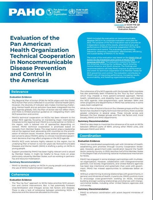 The overall purpose of the evaluation was to determine the level of results attainment and performance for NCD prevention and control. The evaluation’s three objectives included documenting key achievements and challenges, examining enabling and limiting factors, and providing lessons learned and evidence-based recommendations. The scope of the evaluation was determined by the scope of the POA and covered the period from 2013 and the region of the Americas including the sub-regions of the Caribbean, Central America, and South America.