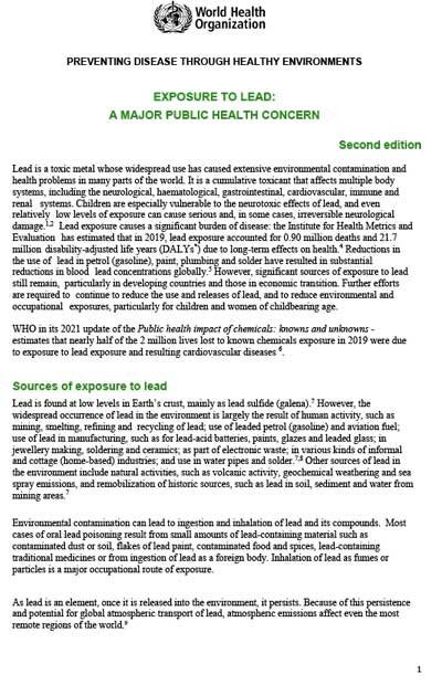 Lead is a toxic metal whose widespread use has caused extensive environmental contamination and health problems in many parts of the world. It is a cumulative toxicant that affects multiple body systems, including the neurological, haematological, gastrointestinal, cardiovascular, immune and renal systems. Children are especially vulnerable to the neurotoxic effects of lead, and even relatively low levels of exposure can cause serious and, in some cases, irreversible neurological damage.