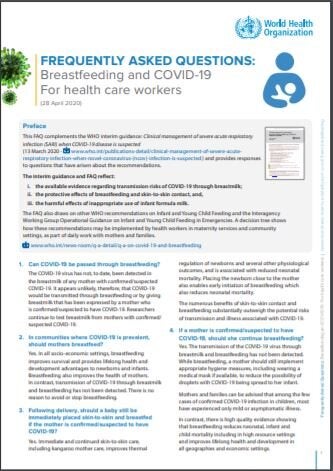 This FAQ, published on April 28th, 2020, complements the WHO interim guidance: Clinical management of severe acute respiratory infection (SARI) when COVID-19 disease is suspected (13 March 2020 - www.who.int/publications-detail/clinical-management-of-severe-acuterespiratory-infection-when-novel-coronavirus-(ncov)-infection-is-suspected ) and provides responses to questions that have arisen about the recommendations. The interim guidance and FAQ reflect: i. the available evidence regarding transmission risks of COVID-19 through breastmilk; ii. the protective effects of breastfeeding and skin-to-skin contact, and, iii. the harmful effects of inappropriate use of infant formula milk. The FAQ also draws on other WHO recommendations on Infant and Young Child Feeding and the Interagency Working Group Operational Guidance on Infant and Young Child Feeding in Emergencies.
