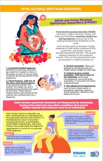The alcohol fact-sheets series presents basic concepts about alcohol and health. This factsheet defines and describes fetal alcohol spectrum disorders, their consequences throughout life and the importance to recognize them. It also highlights actions for diagnosis, interventions and to raise awareness on the topic, as well as key recommendations to the target audience.
