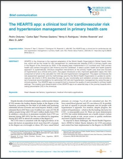 HEARTS in the Americas is the regional adaptation of the World Health Organization’s Global Hearts Initiative, which will be the model for risk management for cardiovascular disease (CVD) in primary health care in the Region of the Americas by 2025. It has already been implemented in 21 countries and 1045 primary health care centers throughout Latin America and the Caribbean. It takes a public health and health systems approach to systematically introduce simplified interventions at the primary health care level and focuses on hypertension as a clinical entry point. This paper introduces a new, improved application (app), the main component of which is the calculator for CVD risk and hypertension management. The paper summarizes the risk assessment approach and the methodology used by the World Health Organization to update its cardiovascular risk charts in 2019; describes the app, its use, functionality and validation process; and provides a set of practical recommendations for optimizing CVD risk and hypertension management by using the app in clinical practice. The HEARTS app is a powerful tool to improve the quality of care provided in primary health settings. The creation and dissemination of the HEARTS app is an essential step in the journey towards eliminating preventable CVD in the Americas.