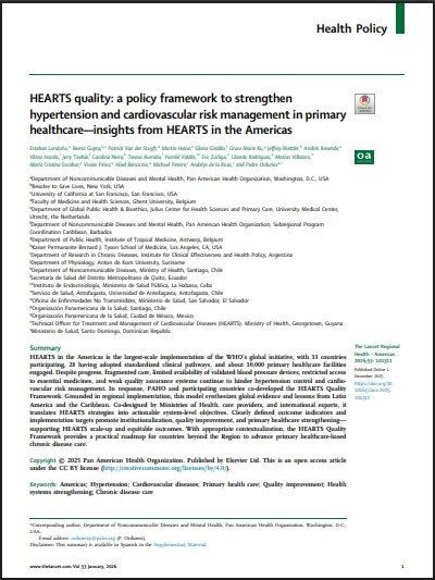 SummaryHEARTS in the Americas is the largest-scale implementation of the WHO's global initiative, with 33 countries participating, 28 having adopted standardized clinical pathways, and about 10,000 primary healthcare facilities engaged. Despite progress, fragmented care, limited availability of validated blood pressure devices, restricted access to essential medicines, and weak quality assurance systems continue to hinder hypertension control and cardiovascular risk management. In response, PAHO and participating countries co-developed the HEARTS Quality Framework. Grounded in regional implementation, this model synthesizes global evidence and lessons from Latin America and the Caribbean. Co-designed by Ministries of Health, care providers, and international experts, it translates HEARTS strategies into actionable system-level objectives. Clearly defined outcome indicators and implementation targets promote institutionalization, quality improvement, and primary healthcare strengthening—supporting HEARTS scale-up and equitable outcomes. With appropriate contextualization, the HEARTS Quality Framework provides a practical roadmap for countries beyond the Region to advance primary healthcare-based chronic disease care. |