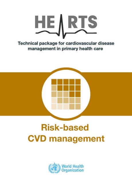 OverviewThe HEARTS technical package provides a strategic approach to improving cardiovascular health in countries. It comprises six modules and an implementation guide. This package supports ministries of health to strengthen CVD management in primary health care settings. The practical, step-by-step modules are supported by an overarching technical document that provides a rationale and framework for this integrated approach to the management of NCDs. More people die from cardiovascular diseases (CVDs) than from any other cause. Over three quarters of heart disease and stroke related deaths occur in low- and middle-income countries. The HEARTS modules are intended for use by policy-makers and programme managers at different levels within ministries of health, and within resource limited settings, who can influence CVD primary care delivery. The HEARTS technical package is part of the broader Global Hearts Initiative which includes two other packages that address the prevention of CVDs. The HEARTS modules were developed under the auspices of the Global Hearts Initiative, led by WHO and the US Centers for Disease Control and Prevention. This module includes information on a total risk approach to the assessment and management of CVD, including country-specific risk charts. |