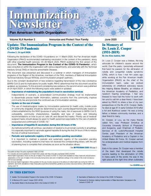 In this edition: Update: The Immunization Program in the Context of the COVID-19 Pandemic | In Memory of Dr. Louis Z. Cooper (1931-2019) | Vaccination Week in the Americas 2020 in the Context of COVID-19 | Vaccination of Newborns in the Context of the COVID-19 Pandemic | Framework for Decision-making: Implementation of Mass Vaccination Campaigns in the Context of COVID-19P