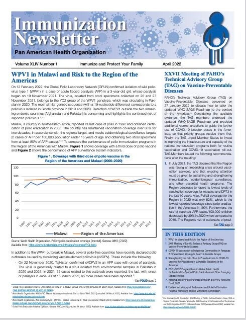IN THIS EDITION: WPV in Malawi and Risk to the Region of the Americas | XXVII Meeting of PAHO’s Technical Advisory Group (TAG) on Vaccine-Preventable Diseases | COVID-19 Vaccination in Indigenous Communities in Paraguay: A Differentiated Strategy to Reach Vulnerable Groups | Strengthening the Cold Chain to Provide Access to COVID-19 Vaccines for Populations in Vulnerable Situations in the Americas | CDC's STOP Program Recruits Global Public Health Professionals to Support Polio Eradication and Other Emerging Disease Threats | Vaccines and Syringes Purchased through the PAHO Revolving Fund, 2022 | First Annual Meeting of the Measles and Rubella Elimination Regional Monitoring and Re-Verification Commission.