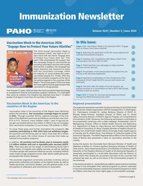 The Pan American Health Organization (PAHO) publishes the Immunization Newsletter four times a year in English, French, Portuguese, and Spanish. Its purpose is to facilitate the exchange of ideas and information on immunization programs in the Region of the Americas and beyond. It has been published since 1979 in English and Spanish, with French and Portuguese versions beginning in 2001 and 2019, respectively. |